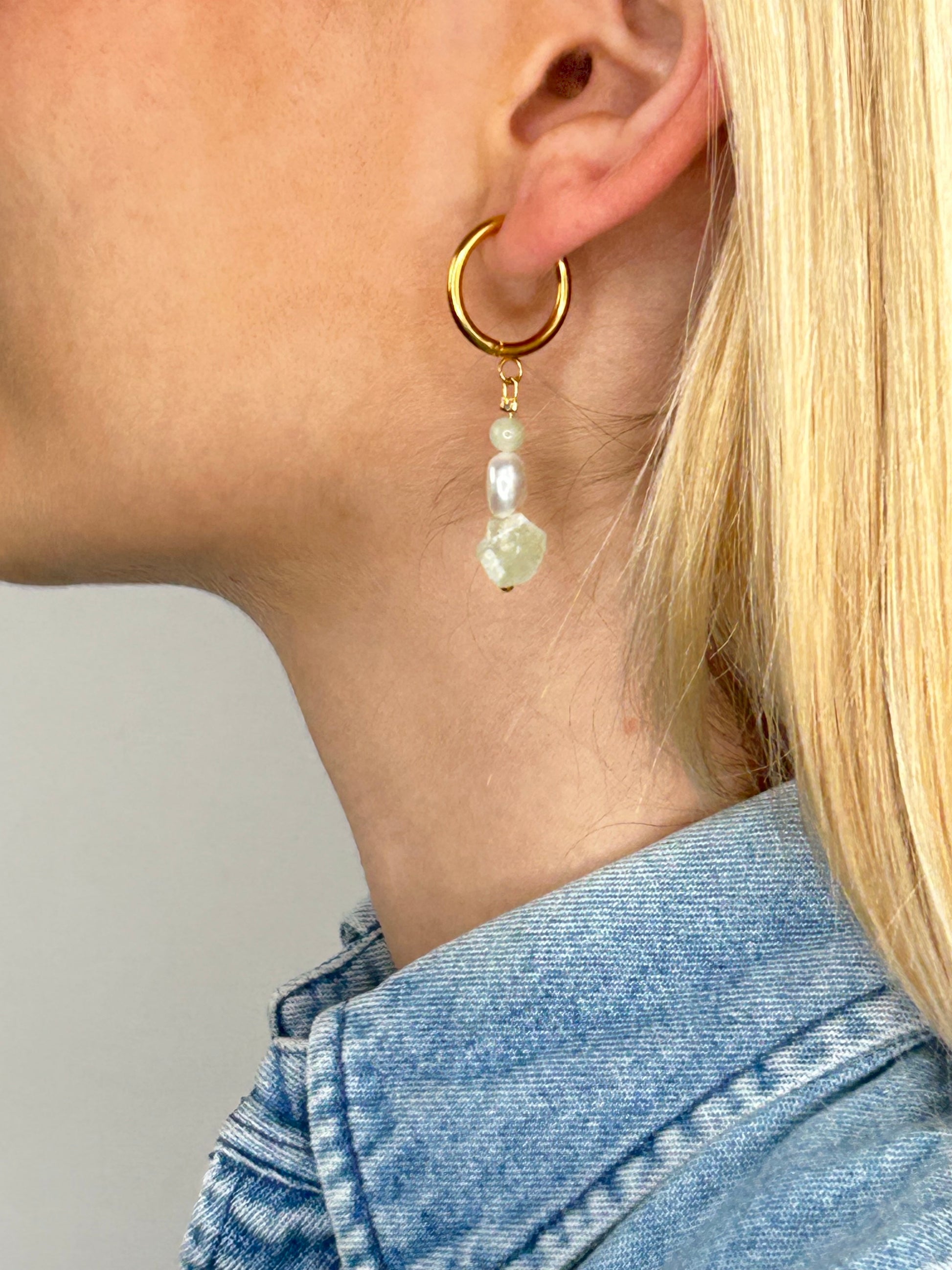 Unser handgefertigter Ohrring Nayla kombiniert Eleganz mit Moderne, ob als Alltagsbegleiter, oder zum Abendoutfit, lässt er sich vielfach kombinieren. Er besteht aus natürlichen Edelsteinen, kombiniert mit einer Süßwasserperle und ist in vielen Farben, sowie in Gold- und Silber-Varianten verfügbar. Die Handarbeit und Naturmaterialien machen jeden Ohrring zu einem Einzelstück, das Deine Individualität unterstreicht.